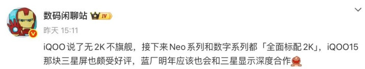 近日,博主@数码闲聊站 的一份爆料中提到,“iQOO说了无2K不旗舰,接下来Neo系列和数字系列都「全面标配2K」,iQOO15那块三星屏也颇受好评,蓝厂明年应该也会和三星显示深度合作”。