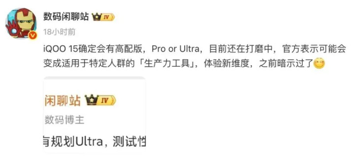 爆料显示,“iQOO 15确定会有高配版,Pro or Ultra,目前还在打磨中,官方表示可能会变成适用于特定人群的「生产力工具」,体验新维度,之前暗示过了”。
