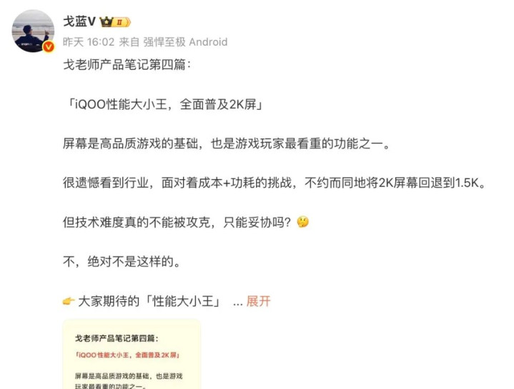 iQOO 产品经理 @戈蓝V 也曾表示过:
