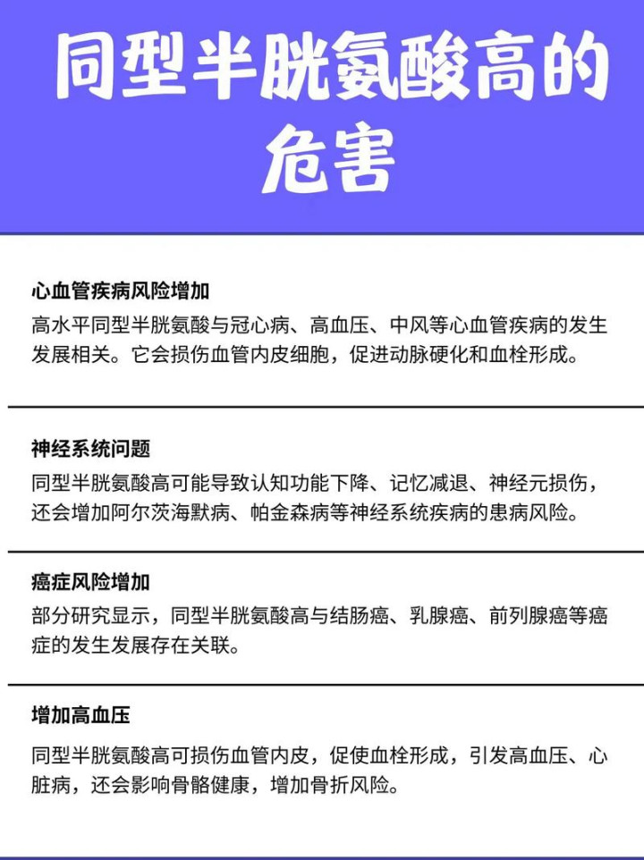 但如果叶酸、维B6、维B12不足,或者受遗传、饮食、疾病影响,这个“废料”就会积起来,数值越高,对血管越不友好。