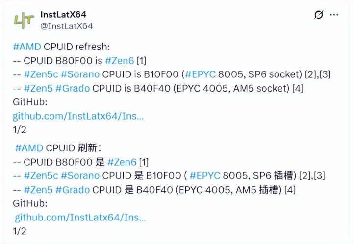 AMD下一代Zen 6处理器架构的更多细节近期浮出水面,据@InstLatX64从AMD更新后核心代码中推断,Zen 6的ID编号为B80F00,并确认该架构将采用台积电2nm制程技术(低功耗版本除外)。