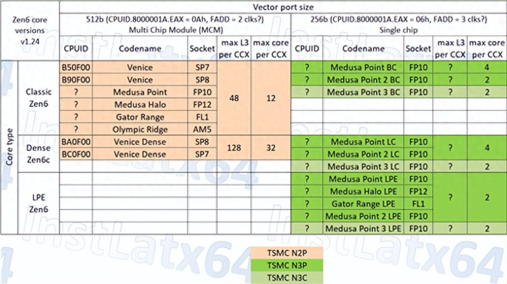 其还根据代号整理出一系列产品,发现Zen6将有三种版本:Classic Zen 6、Dense Zen 6c、LPE Zen 6。