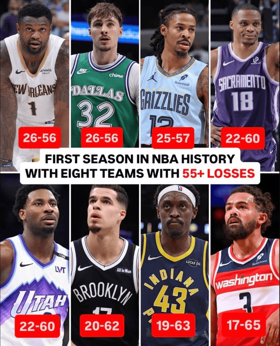 历史首次出现8支球队单赛季输掉55场或更多,同时也是NBA历史上首个有八支球队胜率达到33.3%或更低的赛季。