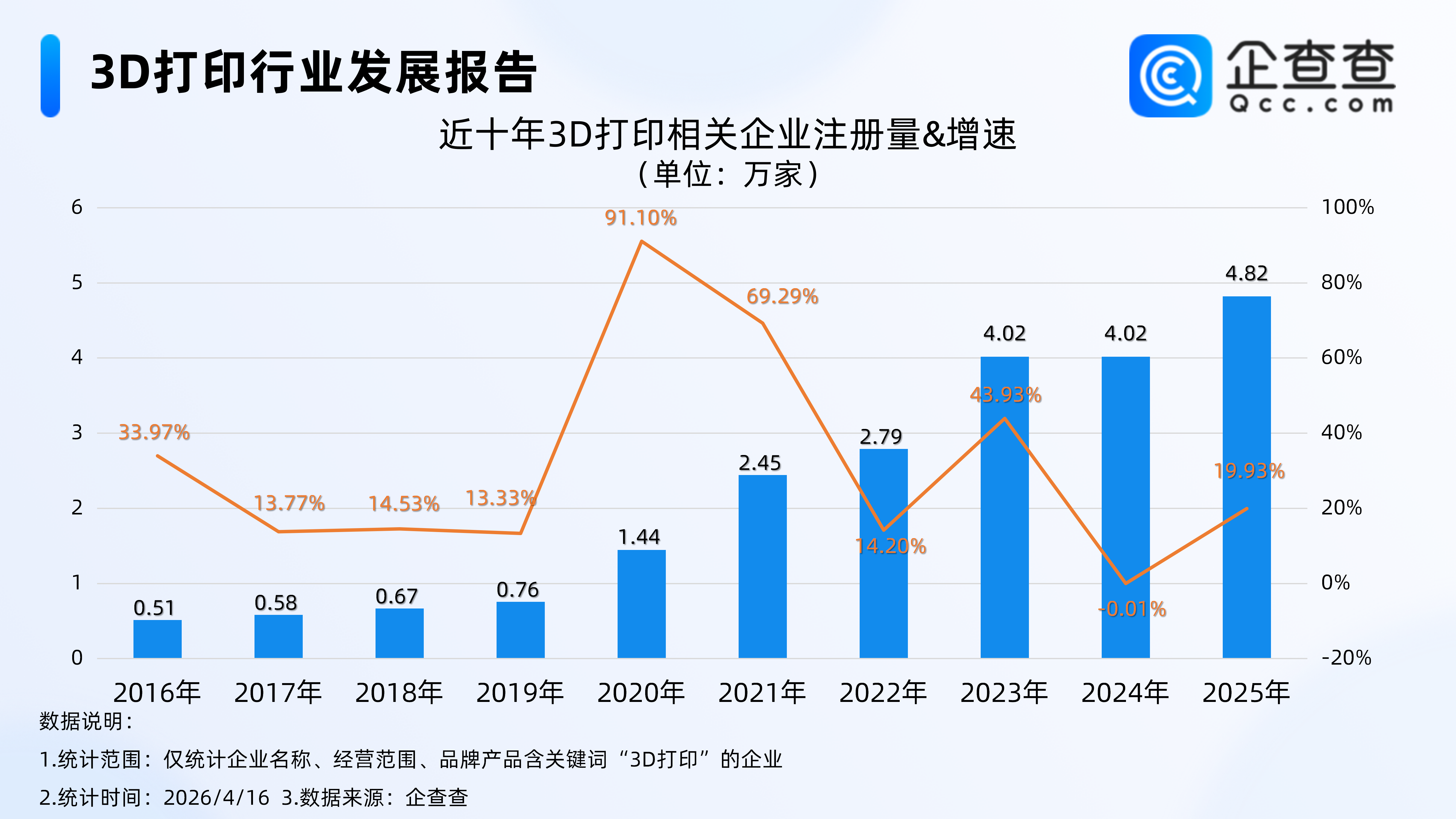 企查查数据显示,近十年,国内3D打印相关企业注册量整体呈逐年上涨趋势。2016年至2019年,年注册量保持在0.5万家至0.8万家之间,增速相对平稳。2020年注册量跃升至1.44万家,同比增长91.10%,创近十年注册增速峰值;2023年-2025年连续3年注册量在4万家以上,其中2025年注册量同比增长19.93%至4.82万家,创近十年注册量新高。
