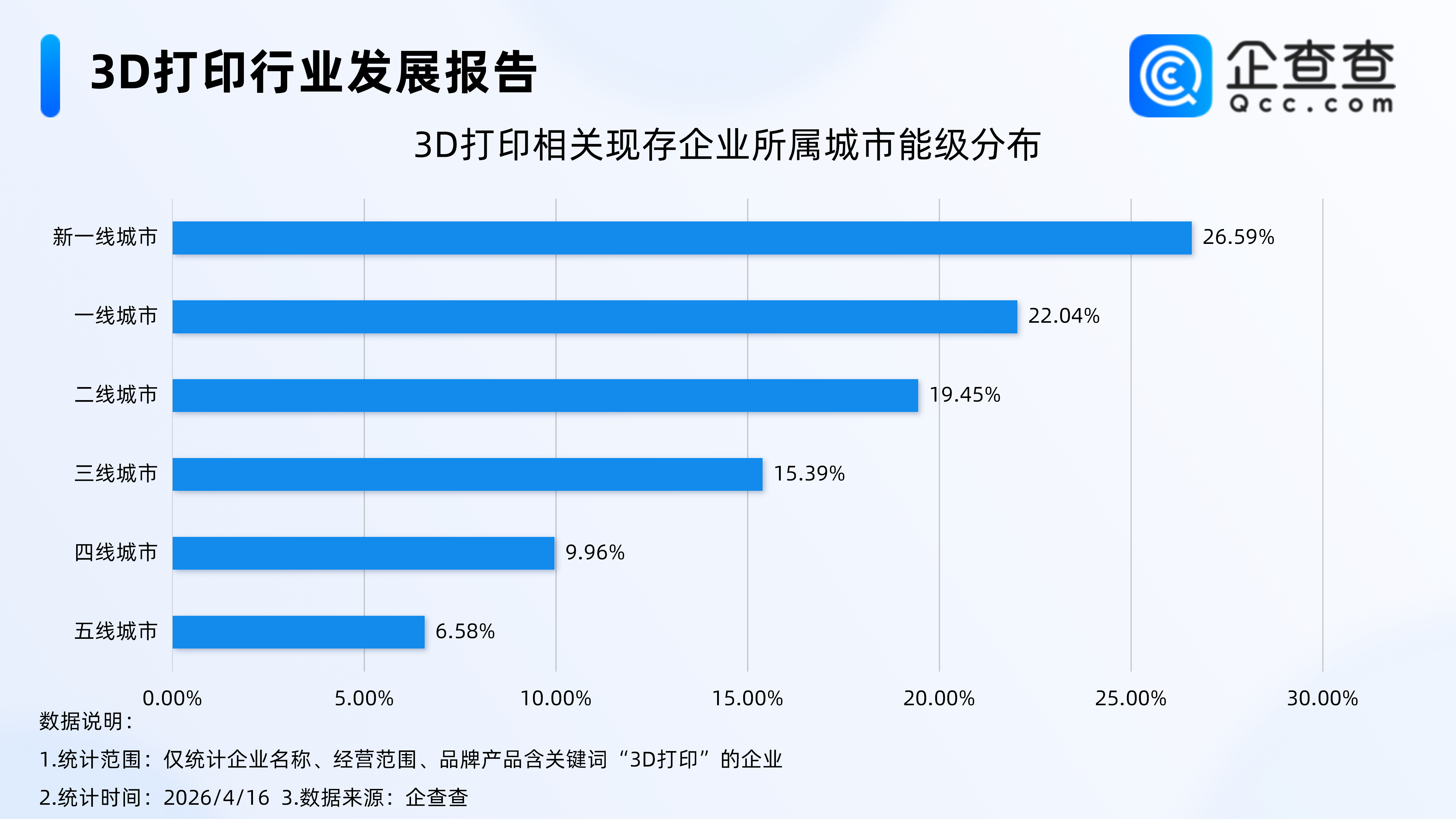 企查查数据显示,从城市能级分布上看,国内3D打印相关现存企业主要分布在新一线、一线城市,分别占比26.59%、22.04%。分布在二线、三线城市的相关企业均占比在15%-20%之间。四线、五线城市占比均不足10%。