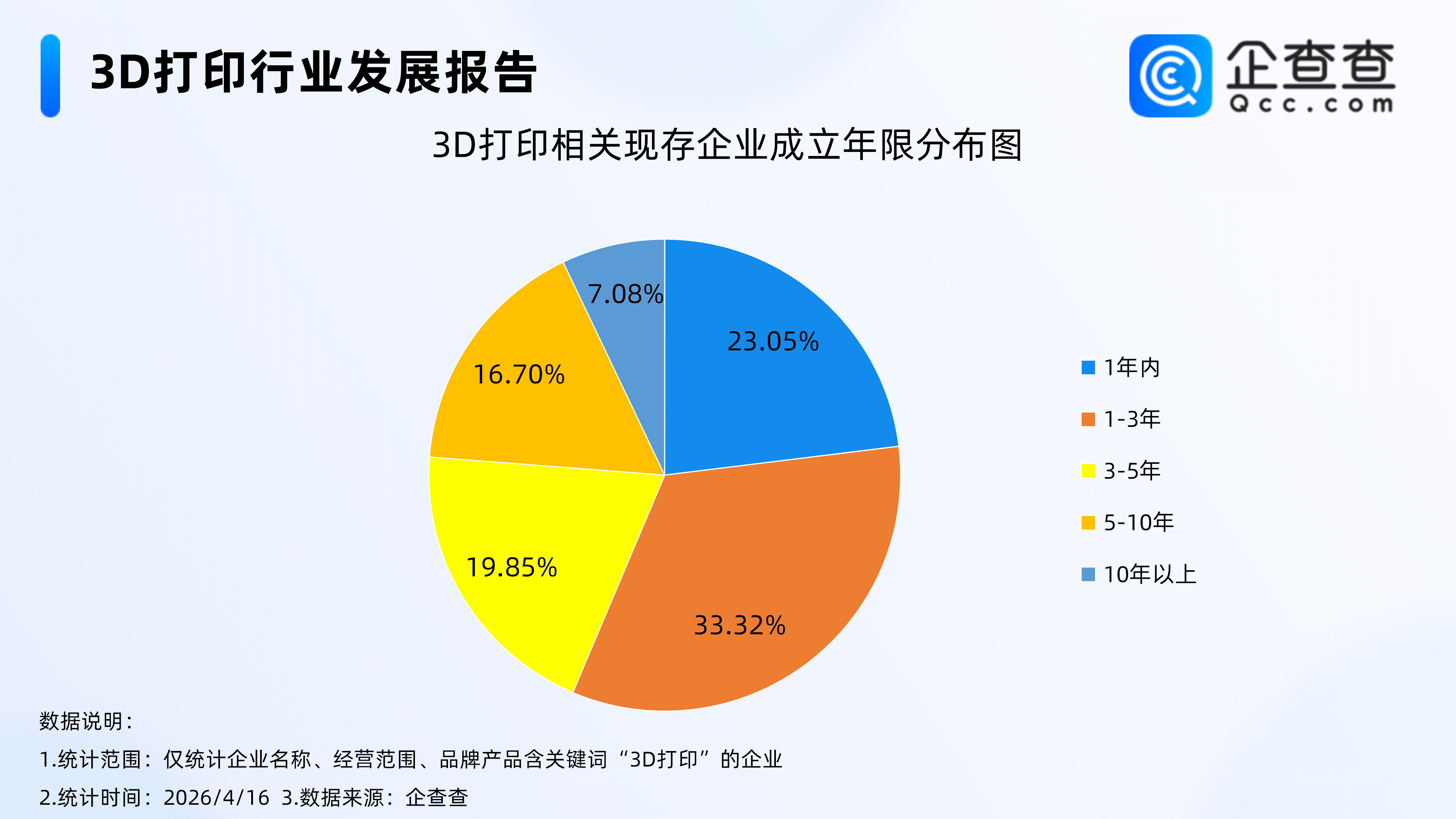 企查查数据显示,成立年限分布上,3D打印相关现存企业普遍“年轻化”,超5成相关企业成立在3年内,其中成立年限在1-3年的相关企业最多,占比33.32%。成立10年以上的企业占比最低,为7.08%。整体来看,3D打印相关企业群体较为年轻,行业仍处于快速发展阶段。