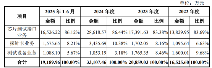 2022年至2024年及截至2025年6月30日,韬盛科技芯片测试接口业务营收分别为13,829.95万元、17,391.63万元、28,618.57万元、16,526.22万元,占当期主营业务收入的比例分别为83.69%、83.38%、86.44%、86.12%,占比持续居高不下。